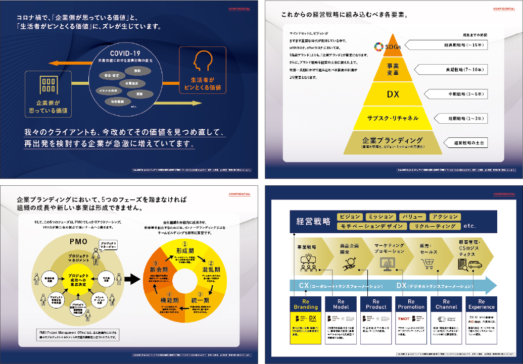 そうした時代に企業や事業の変革へと導く2つのリブランディングメソッドをリリースしました。企業の体質変革(CX:コーポレートトランスフォーメ―ション)を実行するための「企業リブランディング」、商品・サービスの提供方法つまりビジネスモデルから見直すための「商品リブランディング」というYRK&独自メソッドによるコンサルティングサービスを是非ご期待ください。