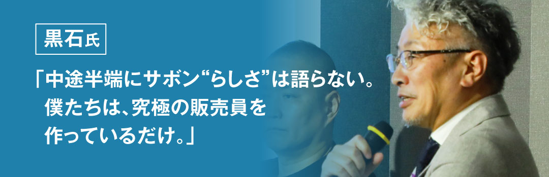 「世界中でサボンらしさを語れるのは、創業者であるアヴィ・ピアトクしかいない。」ブランディングを考える上で、あえて“らしさ”を語らない黒石氏。「イスラエルの人々が死海の塩を使って、自然のミネラル豊富なところだけを化粧品に変えていく。これを日本流にアレンジするなんておこがましくて言えないです。」製造者の思いを日本のお客さまに伝えるために、スタッフがイスラエルの製造工場を手伝うこともあるという。「中途半端にサボンらしさを語るのではなく、究極の販売員を作っているに過ぎない。その上で、我々のミッションは、とあるおじいちゃんが泥だらけになって、お風呂入る手前にサボンを持った時の「ニヤッ」っていう顔を作ること。このシーンを作ることが我々の最大のミッションだ。」と続けました。