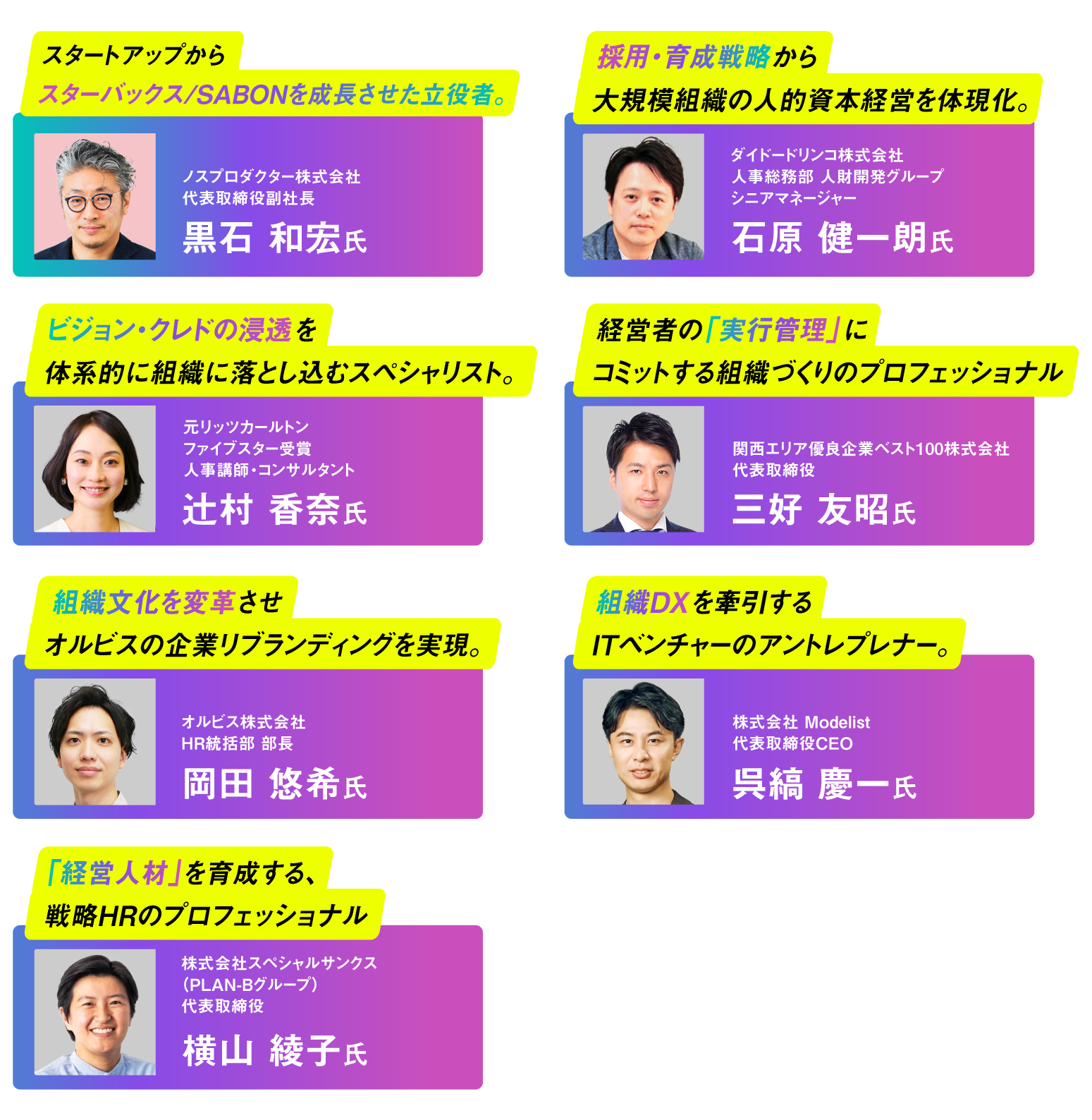 経営戦略と事業成長の観点から、組織作りの真髄を3つのチャプターに分け、7名のゲストスピーカーに余すことなく語っていただきました。ここでは、その一部をダイジェストでお届けいたします。
