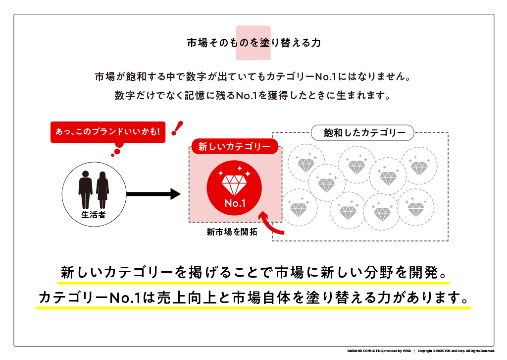 「カテゴリー戦略」とは、既存の飽和した市場で戦うのではなく、「〇〇といえば、このブランド」と思い浮かべてもらえるような「カテゴリーNo.1」を創り出す戦略です。